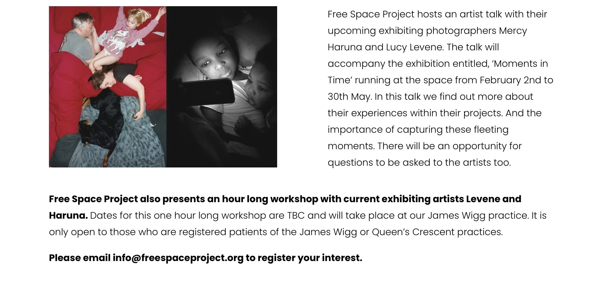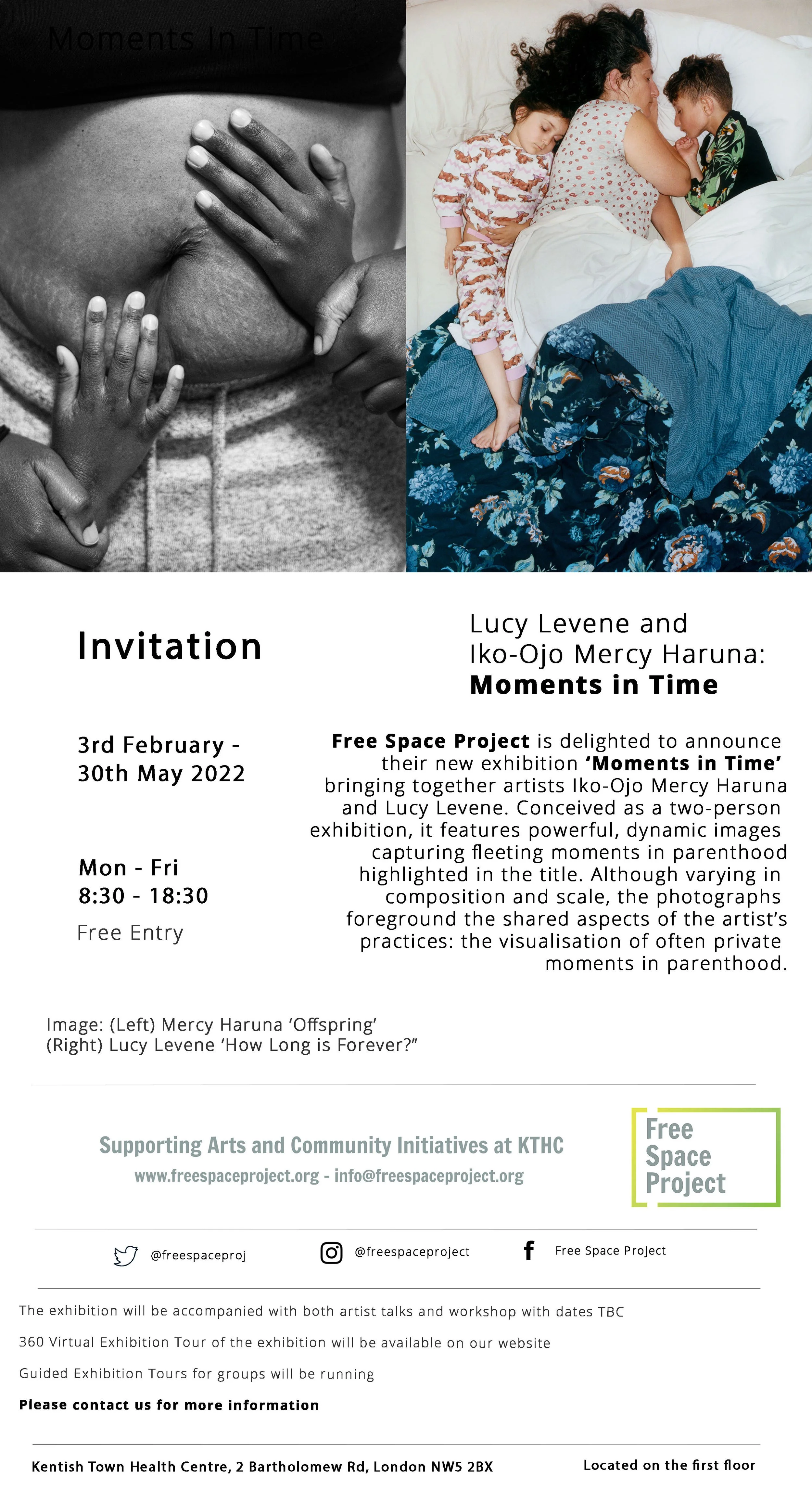 Feb 9 Artist Talk: Iko-Ojo Mercy Haruna and Lucy Levene Wednesday 9 February 2022 18:30 19:30 Google Calendar ICS REGISTER View Event → Feb 3 to 30 May Exhibition "Moments in Time" Thu, 3 Feb 2022 08:30 Mon, 30 May 2022 18:30 Kentish Town Health Centre (map) Google Calendar ICS MORE ABOUT THE EXHIBITION View Event →